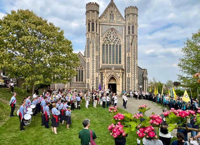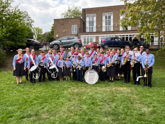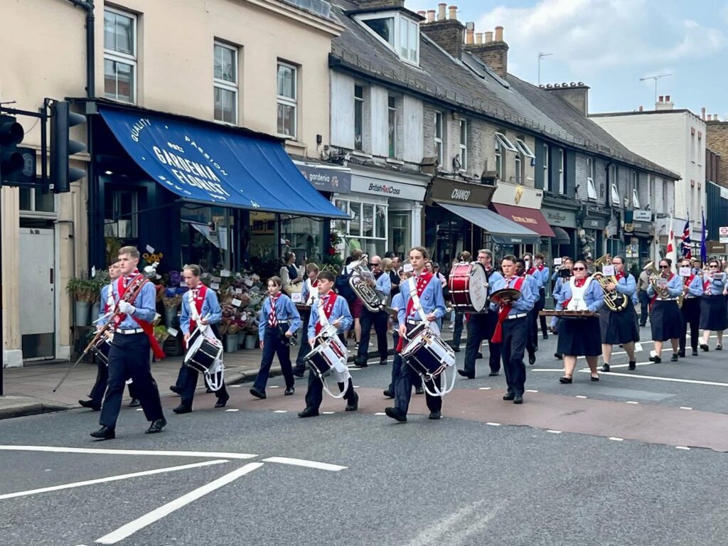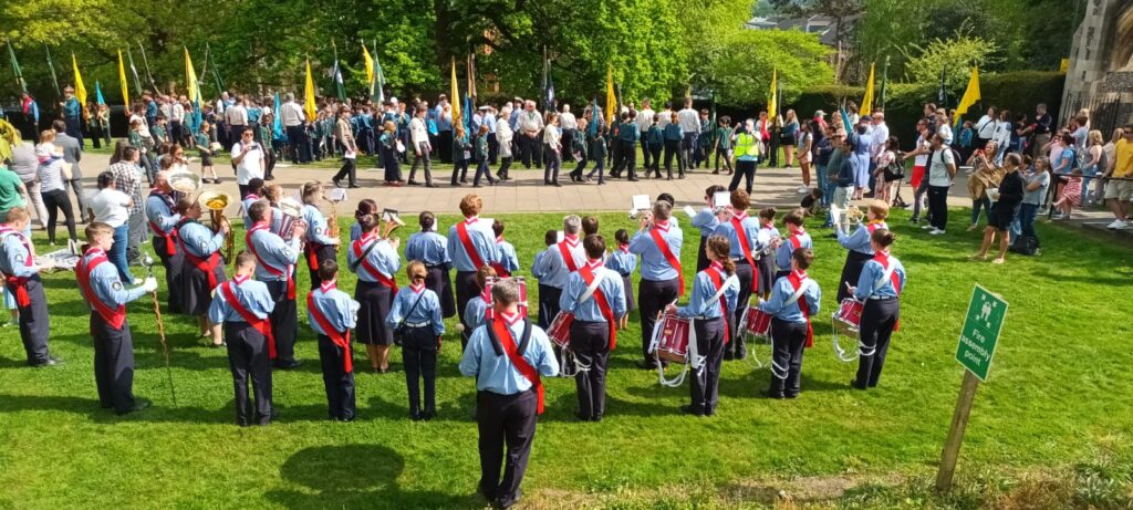 The Band was pleased to be marking this achievement by supporting the St. George’s Day event in neighbouring Wimbledon & Wandle Scout District in 2025. The Parade leads members of the District from Wimbledon Common to the Sacred Heart Church in Edge Hill. The Parade is watched by hundreds of members of the public.